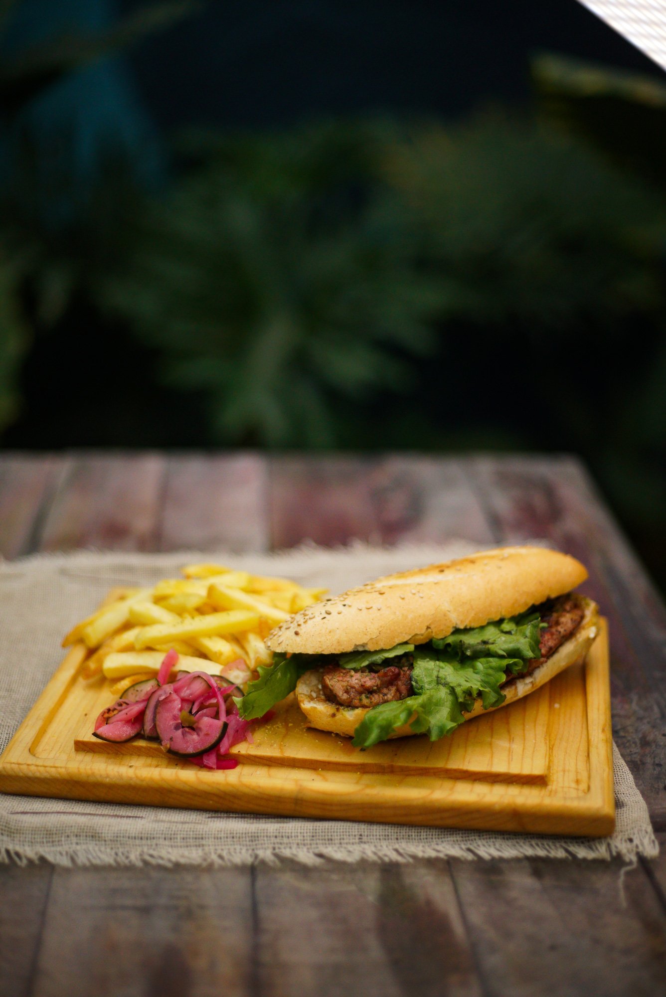 100% Carne de res marinada , queso manchego , vegetales y pan artesanal de la casa